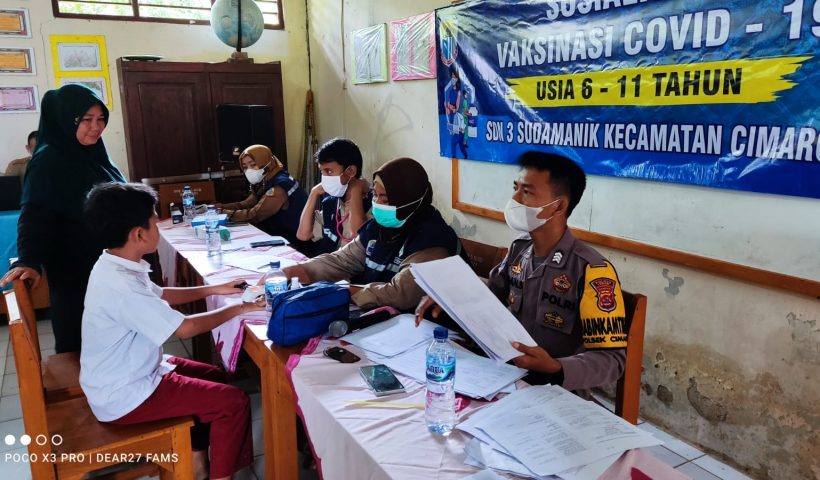LEBAK| Guna Memutus Penyebaran Covid 19, Polsek Cimarga polres lebak melaksanakan giat Vaksinasi Masal serentak, usia 6 – 11 tahun Di SDN 3 Sudamanik Kecamatan…