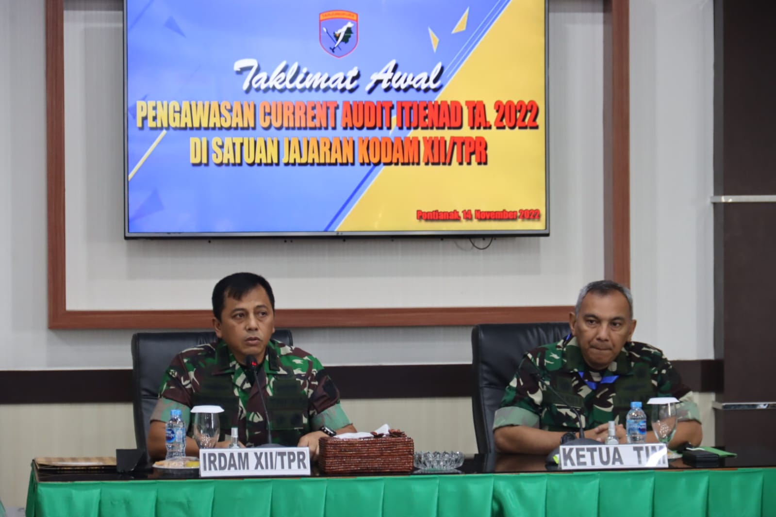 Pengawasan Current Audit tersebut akan dilaksanakan di satuan jajaran Kodam XII/Tpr oleh Tim Pengawas dari Itjenad yang dipimpin oleh Irlog Itben Itjenad, Brigjen TNI M. Zulkifli, S.I.P., M.M. Kegiatan pengawasan dan pemeriksaan ini dimulai dari tanggal 15 sampai dengan 22 November 2022 mendatang.