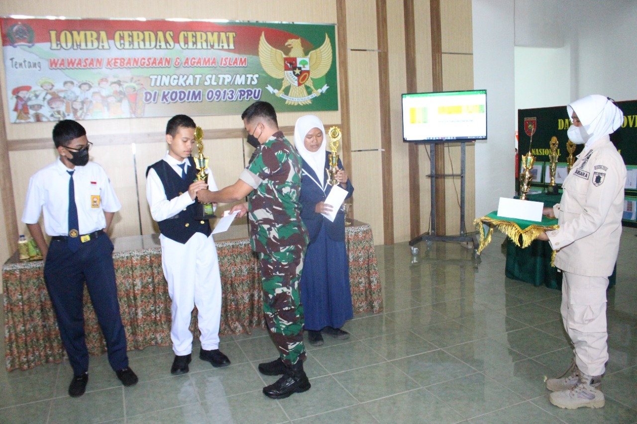 Dandim 0913/PPU Letkol Inf Arfan Affandi menyampaikan “Kegiatan Lomba Cerdas Cermat tentang Wawasan Kebangsaan dan Agama Islam tingkat SMP/Mts tersebut dilaksanakan sebagai upaya memupuk wawasan kebangsaan atau bela negara di kalangan pelajar”.