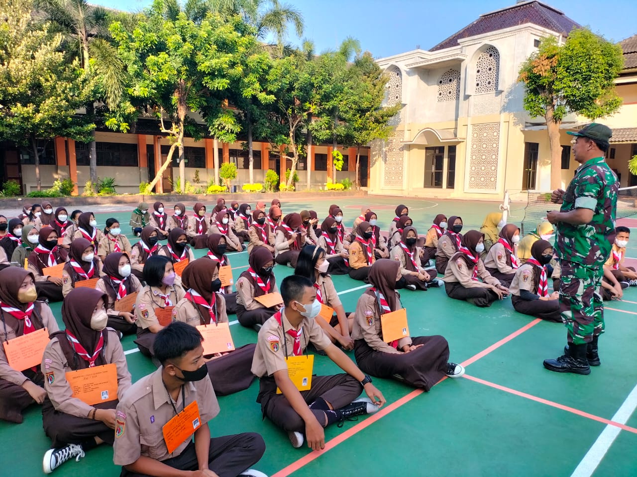 Surakarta – Danramil 03/Serengan Kodim 0735/Surakarta Kapten Inf Narno bersama Babinsa Kel. Danukusuman Sertu Priyanto dan Serda Tito memberikan materi Wawasan Kebangsaan Wasbang dan Pelatihan PBB kepada para Siswa Siswi baru SMK 3 Surakarta Jln Brigjen Sudiarto No. 34, Danukusuman, Kec. Serengan, Kota Surakarta, Jum’at (15/7/2022)