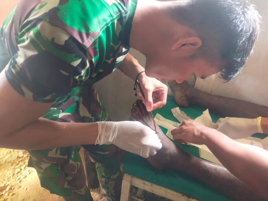 Tim kesehatan Satgas Yonif 501 Kostrad langsung turun tangan, melakukan tindakan medis awal berupa pencabutan besi secara hati-hati, pembersihan luka, serta pemberian perawatan lanjutan guna mencegah infeksi.