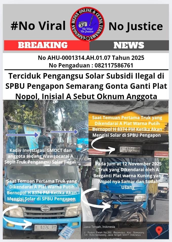Dalam wawancara yang dilakukan Kadiv Investigasi GMOCT Jhon Ahmad kepada sopir berinisial A – yang sebelumnya mengendarai truk dengan nopol H 8374 PM (plat putih) – ditemukan bahwa kendaraan tersebut kini telah berganti plat warna kuning dengan nomor yang samar dan terkesan usang. Menurut Jhon Ahmad, kegiatan pengangsu solar ilegal ini dilakukan dengan berbagai cara, antara lain mengganti plat nomor maupun barcode. Dia meminta BPH Migas dan Polrestabes Semarang segera menindaklanjuti laporan informasi melalui pemberitaan GMOCT.