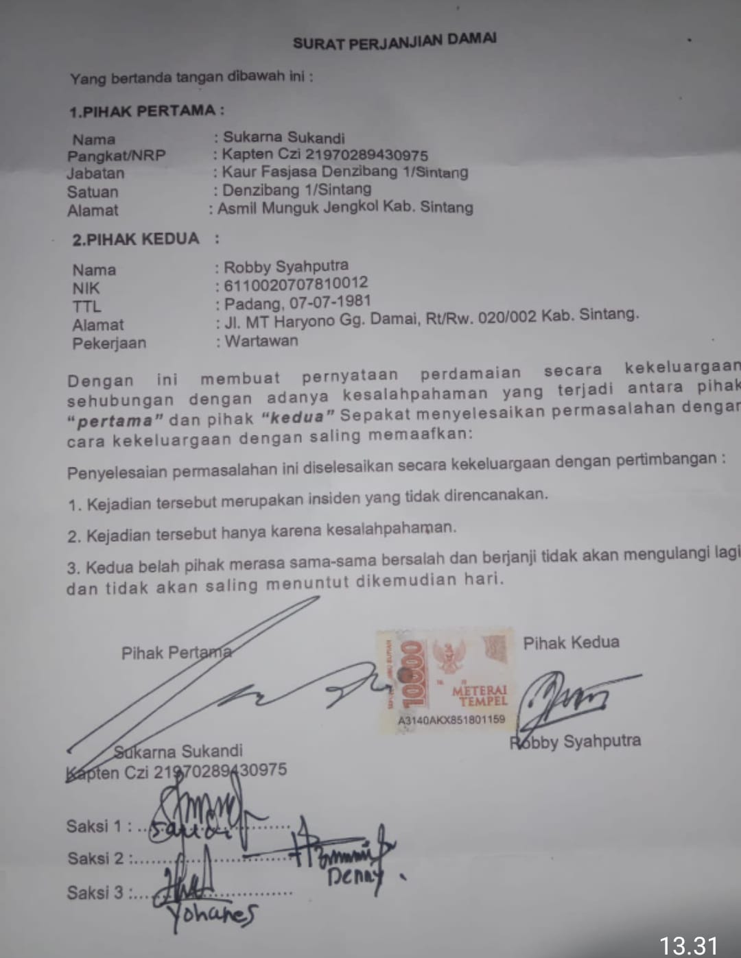 Robby selaku wartawan yang terlibat juga mengungkapkan ; “Saya juga minta maaf atas kata kasar saya, sehingga menyebabkan hal-hal yang tidak diinginkan” Saya juga banyak mengucapkan terimakasih yang sebesar-besarnya kepada Kasi Intel Korem 121/ABW Sintang Kolonel Inf Jhonson Mangasitua Sitorus, atas waktunya dan memberikan ruang untuk menyelesaikan perdamaian ini,. paparnya.