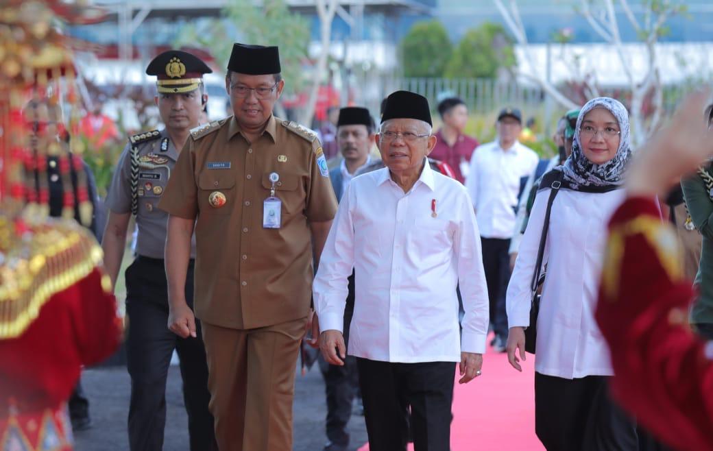 PANGKALPINANG – Penjabat (Pj) Gubernur Kepulauan Bangka Belitung (Babel) Sugito bersama unsur Forkopimda Babel menyambut langsung kedatangan Wakil Presiden (Wapres) Ma’ruf Amin beserta istri di Bandara Depati Amir, Senin (9/9/2024) sore.