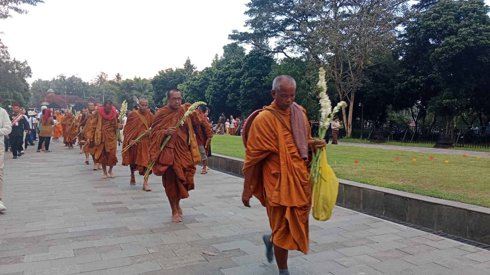 Setelah diberi ucapan selamat datang, para bhikkhu naik ke Candi Borobudur. Selama berjalan menyusuri Marga Utama, mereka diberi setangkai bunga sedap malam oleh umat. Bahkan dengan rasa hormat dan penuh ketulusan, para bhikkhu mendapat taburan bunga mawar merah putih.