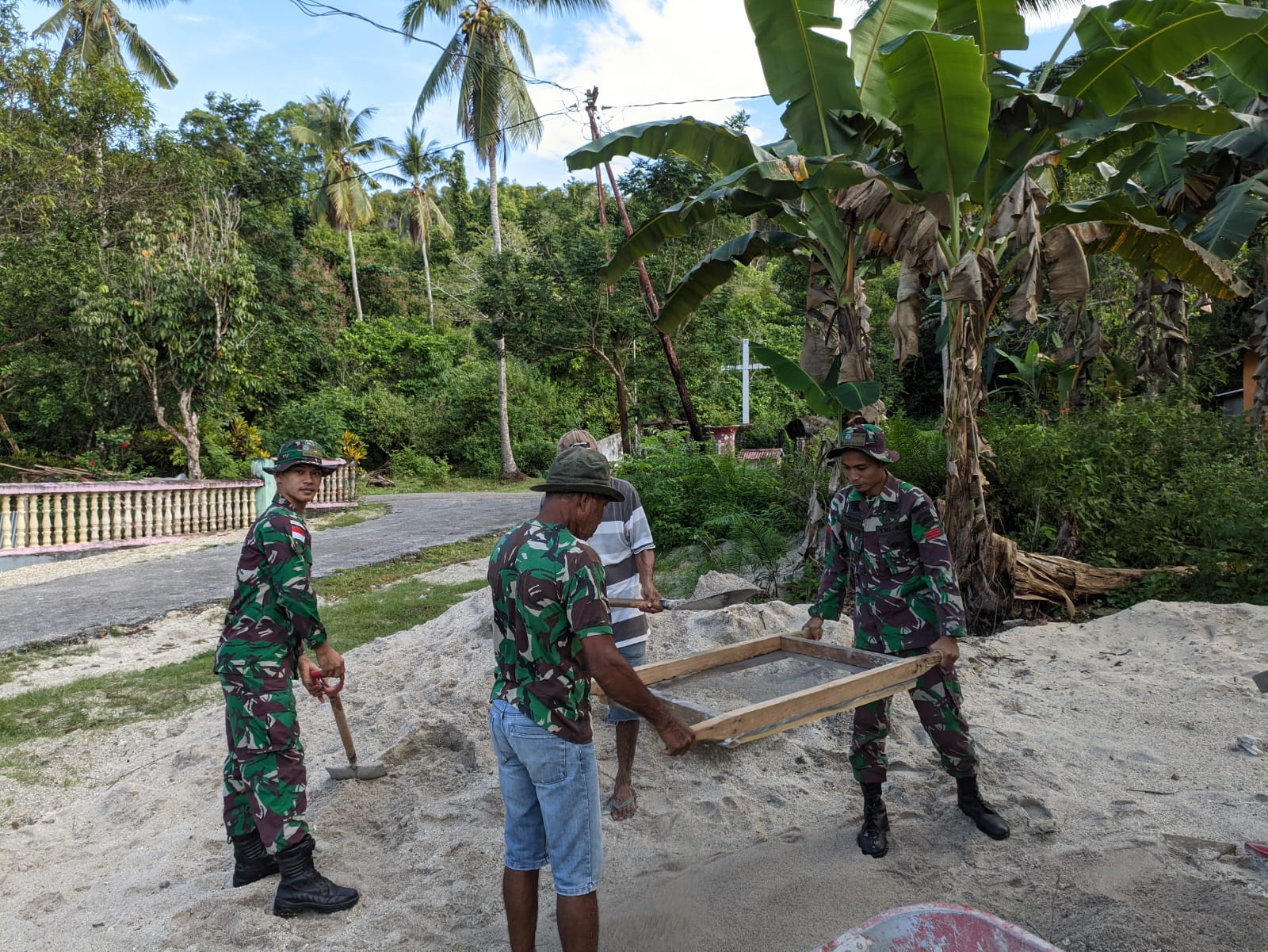 Maluku – Satgas Kodim Maluku Batalyon Arhanud 11/WBY Pos Ramil Porto-Haria membantu masyarakat dalam membangun Gereja di Negeri Porto, Kec. Saparua, Kabupaten Maluku Tengah, Rabu (29/6/2022).