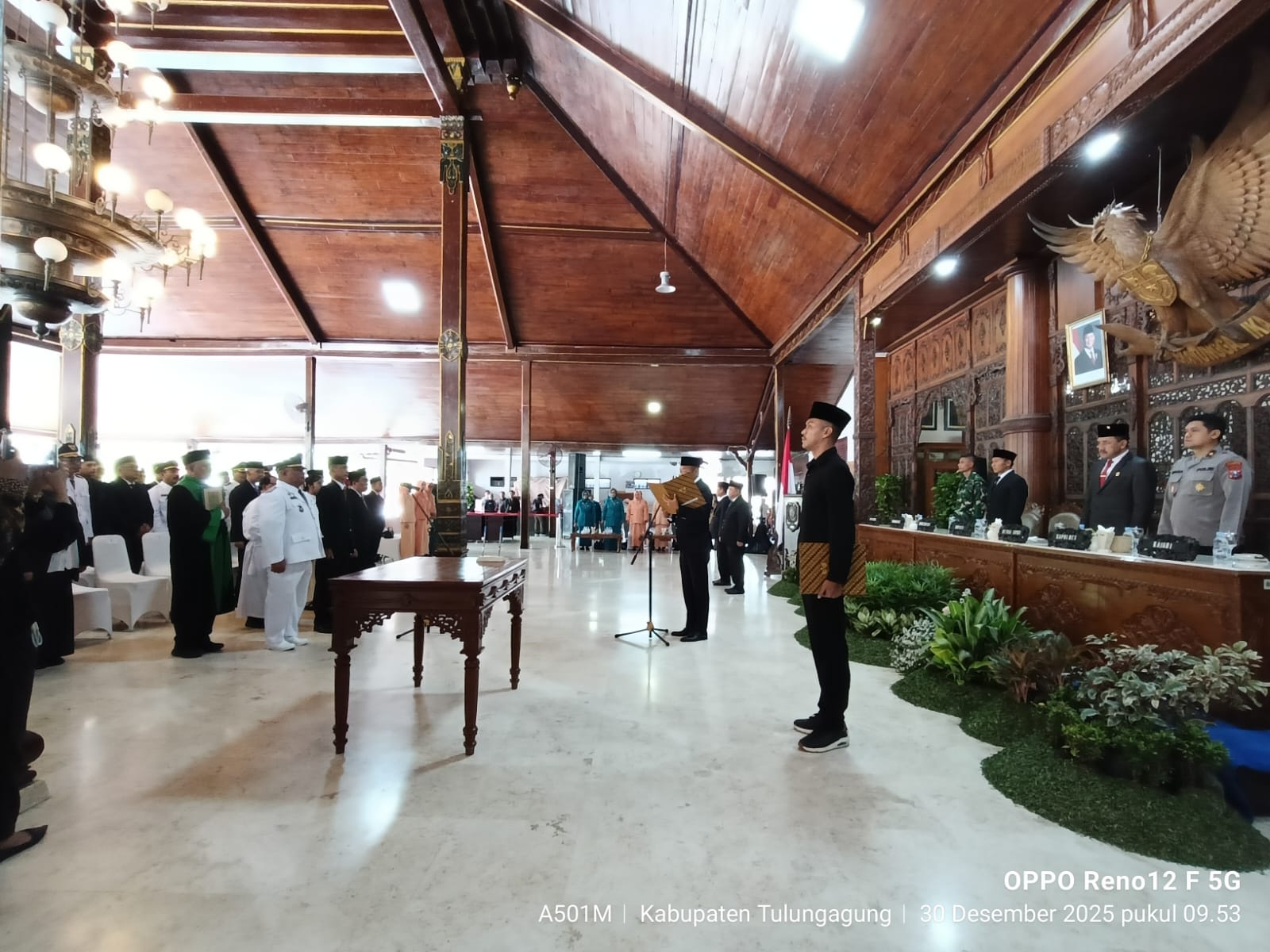 Tulungagung,pelitakota,-Bupati Tulungagung Gatut Sunu Wibowo melantik dan mengambil sumpah/janji jabatan terhadap 141 pejabat administrator dan pejabat pengawas di lingkungan Pemerintah Kabupaten Tulungagung. Pelantikan dilaksanakan pada Selasa, 30 Desember 2025, bertempat di Pendopo Kabupaten Tulungagung, dan berlangsung dengan khidmat.
