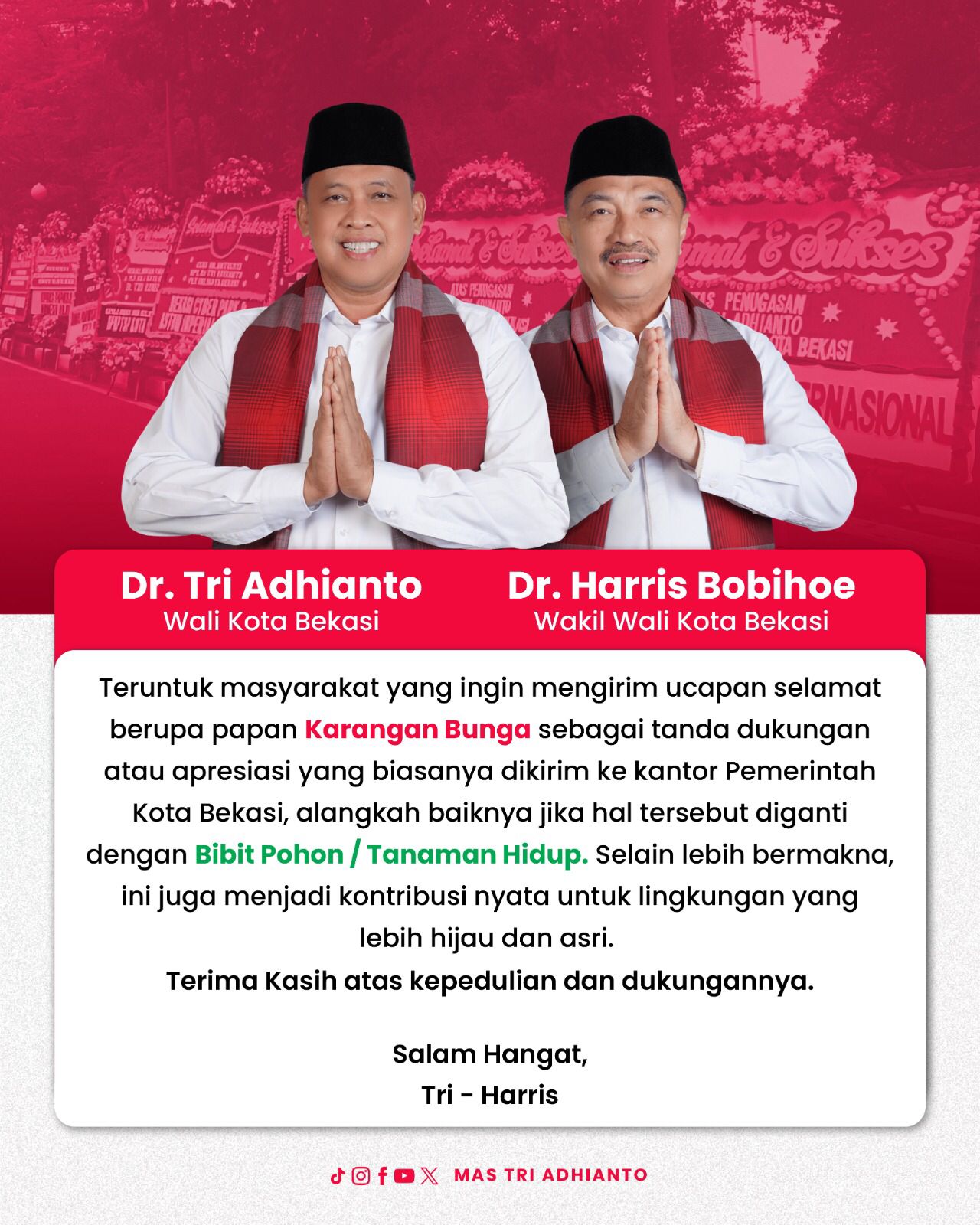 “Teruntuk masyarakat yang ingin mengirim ucapan selamat berupa papan karangan bunga sebagai tanda dukungan atau apresiasi yang biasanya dikirim ke kantor Pemerintah Kota Bekasi, alangkah baiknya jika hal tersebut diganti dengan bibit pohon. Selain lebih bermakna, ini juga menjadi kontribusi nyata untuk lingkungan yang lebih hijau dan asri. Terima kasih atas kepedulian dan dukungannya.” Ujar Tri dalam akunnya.