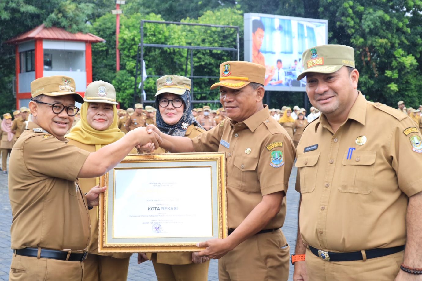 Pj. Wali Kota Bekasi Gani Muhamad menyampaikan apresiasi setingginya kepada para penerima penghargaan juga kepada para pegawai Non ASN di Pemerintah Kota Bekasi yang sudah semangat mengikuti tes P3K dengan nilai yang sangat menggembirakan, juga para peserta yang telah semangat mengikuti apel pagi ini yang sangat teduh cuacanya.