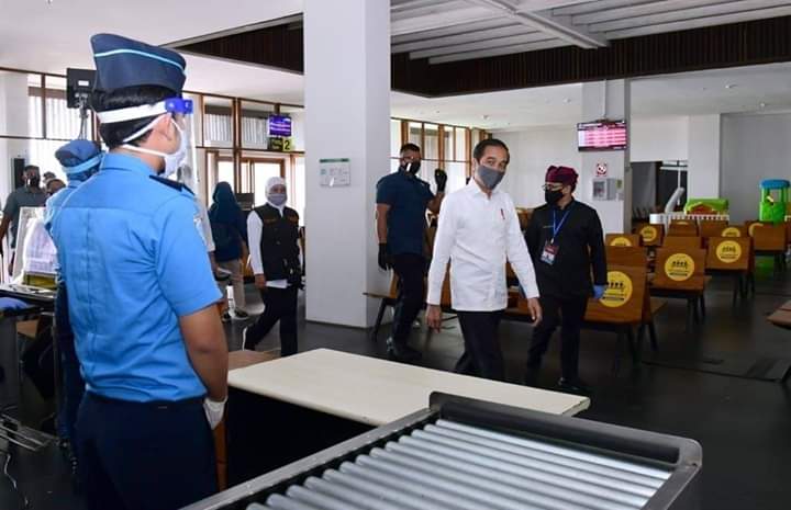 Tiba pada pukul 13.45 WIB di Bandara Internasional Banyuwangi, Kabupaten Banyuwangi, Presiden disambut Bupati Banyuwangi Abdullah Azwar Anas dan kemudian mencoba alat cuci tangan dengan adaptasi kebiasaan baru yang berada di depan ruang tunggu.
