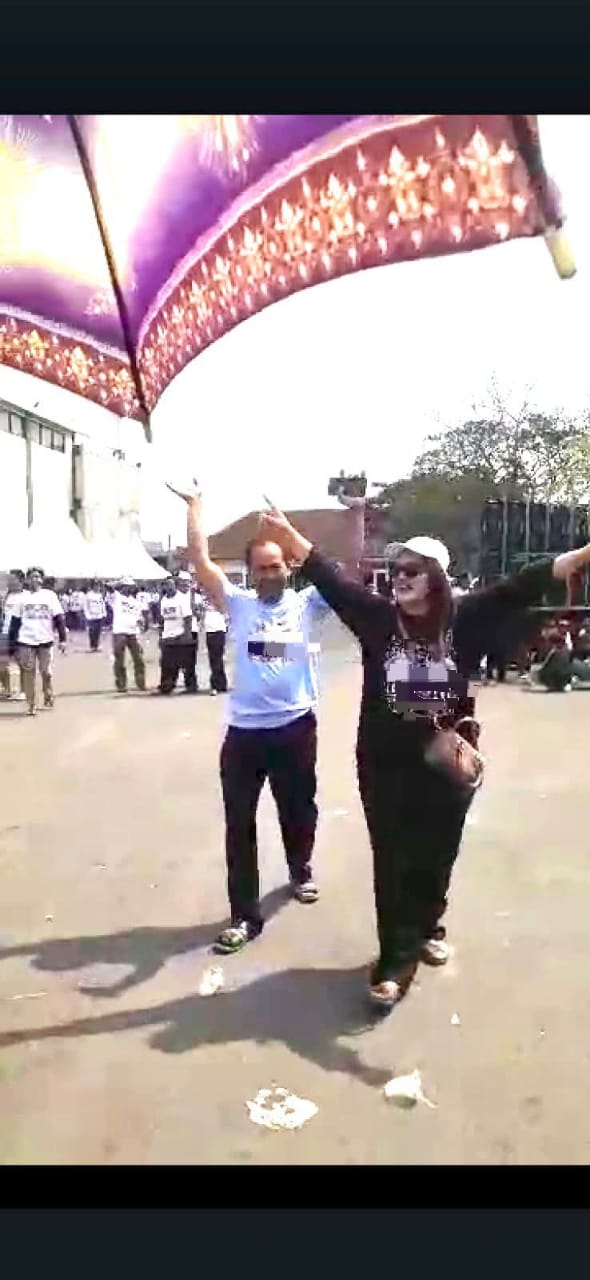 Kedua orang tersebut terlihat berjalan keluar dari rombongan atau kerumunan orang – orang yang rata-rata semua orang yang berada di GOR Lembu Peteng saat itu memakai atribut kaos Paslon.