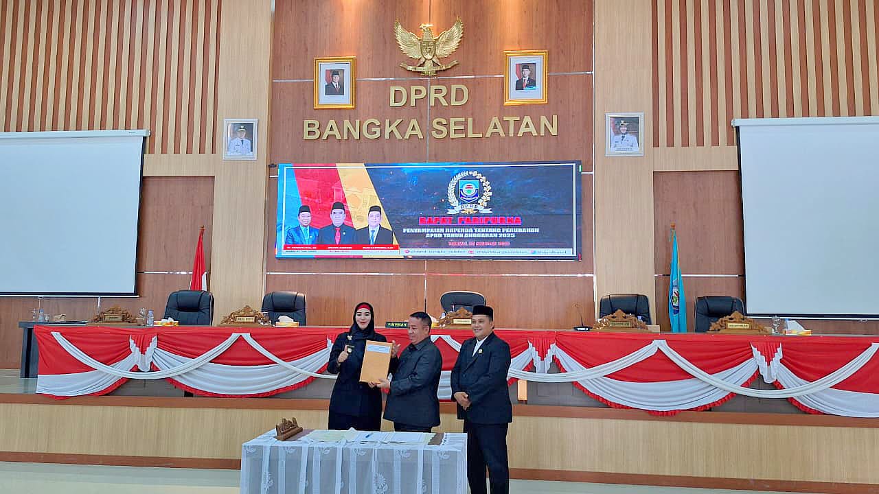 Bangka Selatan – Wakil Bupati Bangka Selatan, Hj. Debby Vita Dewi, S.E., M.M., menghadiri Rapat Paripurna Penyampaian Rancangan Peraturan Daerah tentang Perubahan APBD Tahun Anggaran 2025. Kegiatan ini dilaksanakan di Ruang Rapat Paripurna Junjung Besaoh DPRD Kabupaten Bangka Selatan, Senin (25/8/2025).