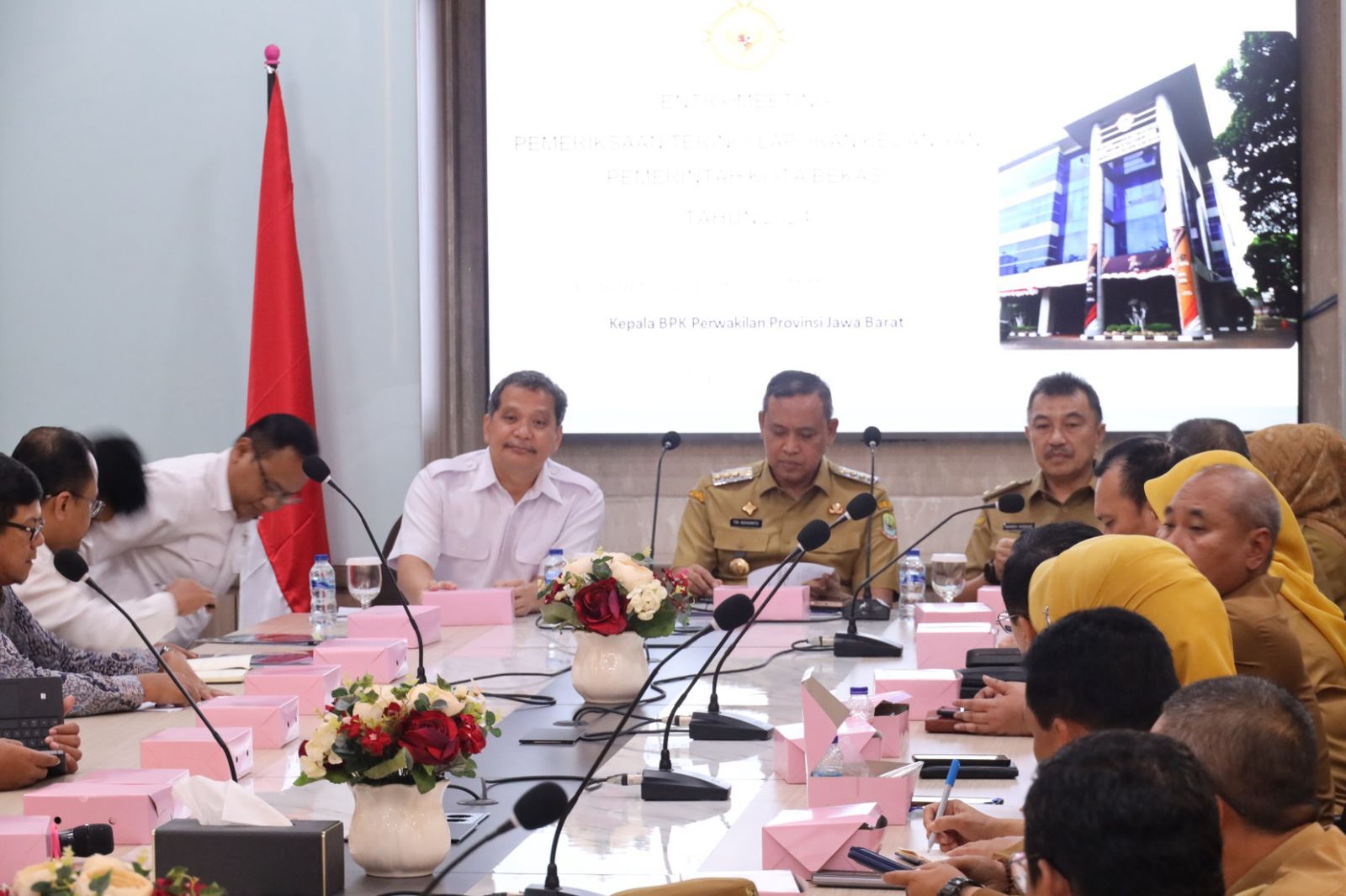 KOTABEKASI – Wali Kota Bekasi Dr Tri Adhianto dan Wakil Wali Kota Bekasi Dr Abdul Harris Bobihoe sambut kehadiran Kepala BPK Perwakilan Provinsi Jawa Barat Eydu Oktain Panjaitan, kehadiran kepala BPK dan jajaran dalam Entry Meeting Pemeriksaan Terinci Laporan Keuangan Pemerintah Kota Bekasi Tahun 2024. Hadir pada kegiatan tersebut para Kepala OPD. Kegiatan berlangsung di Ruang Rapat Wali Kota Bekasi, Jalan Ahmad Yani No. 1.