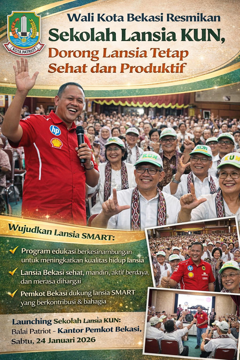 KOTA BEKASI — Pemerintah Kota Bekasi meluncurkan Sekolah Lansia KUN sebagai upaya memperkuat kualitas hidup lanjut usia agar tetap sehat, mandiri, dan produktif. Program tersebut diresmikan langsung oleh Wali Kota Bekasi, Tri Adhianto, di Balai Patriot, kompleks Kantor Pemerintah Kota Bekasi, Sabtu (24/1/2026).