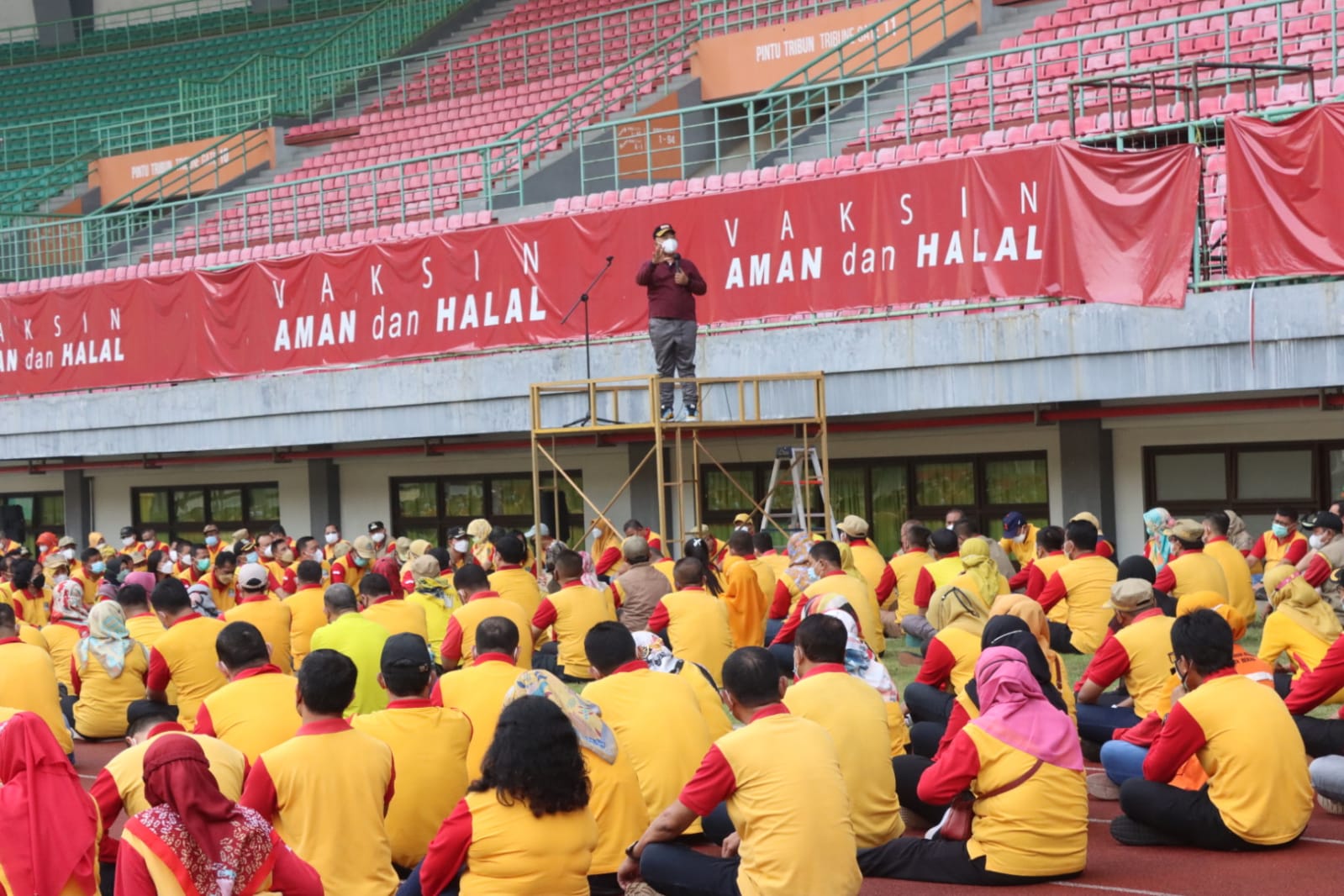Kota Bekasi – Pelitakota.id Wali Kota Bekasi, Rahmat Effendi bersama Wakil Wali Kota Bekasi, Tri Adhianto dan Sekretaris Daerah Kota Bekasi, Reny Hendrawaty mengumpulkan para pejabat esselon II, III dan IV lingkup Pemerintah Kota Bekasi di Stadion Patriot Candrabhaga Kota Bekasi.