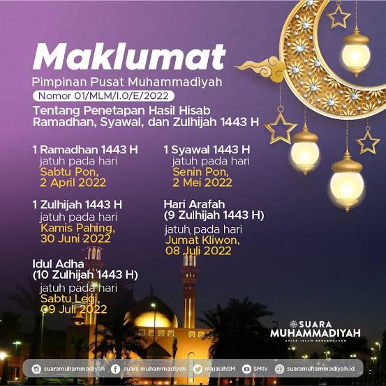 “Menetapkan 1 Ramadhan 1443 H jatuh pada hari Sabtu Pon, 2 April 2022,” bunyi Maklumat PP Muhammadiyah di lansir dari website resmi Persyarikatan Muhammadiyah.