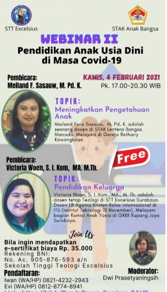 Kajian tentang Pendidikan Anak Usia ini tidak berhenti di sini, tetapi Webinar sesi 3 (dari 5 sesi) Kamis, 11 Februari 2021 dengan narasumber Ii Varia, M.Th. berbicara “Model Pembelajaran Guru di Masa Covid” dan Desi Karo Karo, M.Pd.K. berbicara “Program Belajar Sekolah di Masa Covid-19”. Bila Saudara, orangtua dan guru yang sayang anak, yuk belajar bersama-sama dalam webinar ini. Pendafartan hubungi: Iwan (WA/HP) 0821-4232-2943 dan Evi (WA/HP) 0812-8774-8941.***