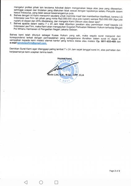LQ Indonesia Lawfirm dalam keterangan resminya menyampaikan “setelah sebelumnya kami adukan atas dugaan pelanggaran etik di Propam Mabes, sekarang kami sesuai hak dan kewenangan kami mengajukan somasi sebelum mengajukan gugatan PMH ke PN Jakarta Selatan. Ini menunjukkan kekecewaan kami, masyarakat dan sesama aparat penegak hukum atas kinerja Tipideksus yang asal-asalan dan tidak sesuai Tupoksinya. Bisa di lihat di video LQ di kanal Youtube LQ Indonesia Lawfirm bagaimana kejanggalan-kejanggalan penanganan kasus Indosurya sangat tumpul ke atas, apalagi di banding kasus Indra Kenz. Dalam kasus Indra Kenz, Vanessa Khong, pacar aja dijadikan tersangka atas penerimaan uang, sedangkan dalam kasus Indosurya, Surya Effendy tidak dijadikan Tersangka padahal ada uang dari Indosurya mengalir ke Indosurya Inti Finance (perusahaan milik Surya Effendy dan Henry Surya) senilai 2 Triliun dan juga tidak disita aliran uang hasil kejahatan tersebut. Apalagi dalam petunjuk jaksa P19 jelas, jaksa memberikan petunjuk agar seluruh aliran dana ke perusahaan affiliasi di sita, dan para penerima aliran dana dan terlibat dijadikan tersangka. Ada apa sampai Whisnu tidak berani terhadap kasus Triliun sedangkan kasus Binomo puluhan Milyar super cepat? Bukankah ini hukum masih tumpul ke atas? Berarti janji Kapolri masih pepesan kosong.” Ucap Alvin Lim