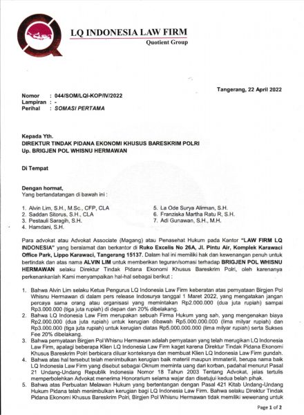 Jakarta – Hari ini LQ Indonesia Lawfirm secara resmi mengirimkan surat Somasi Pertama kepada Jenderal Bintang 1 Mabes POLRI, Brigjen Whisnu Hermawan, atas dugaan perbuatan melawan hukum dengan Nomer Surat 044/SOM/LQI-KOP/IV/2022.